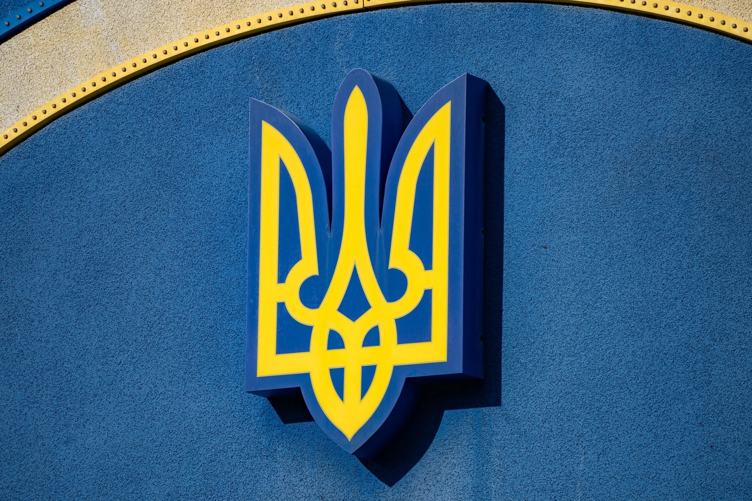 04 October, 2025 - Sumy, Sumy Oblast, Ukraine: A distinctive train shaped building near Sumy train station hosts a bright blue and gold trident on the front of it.