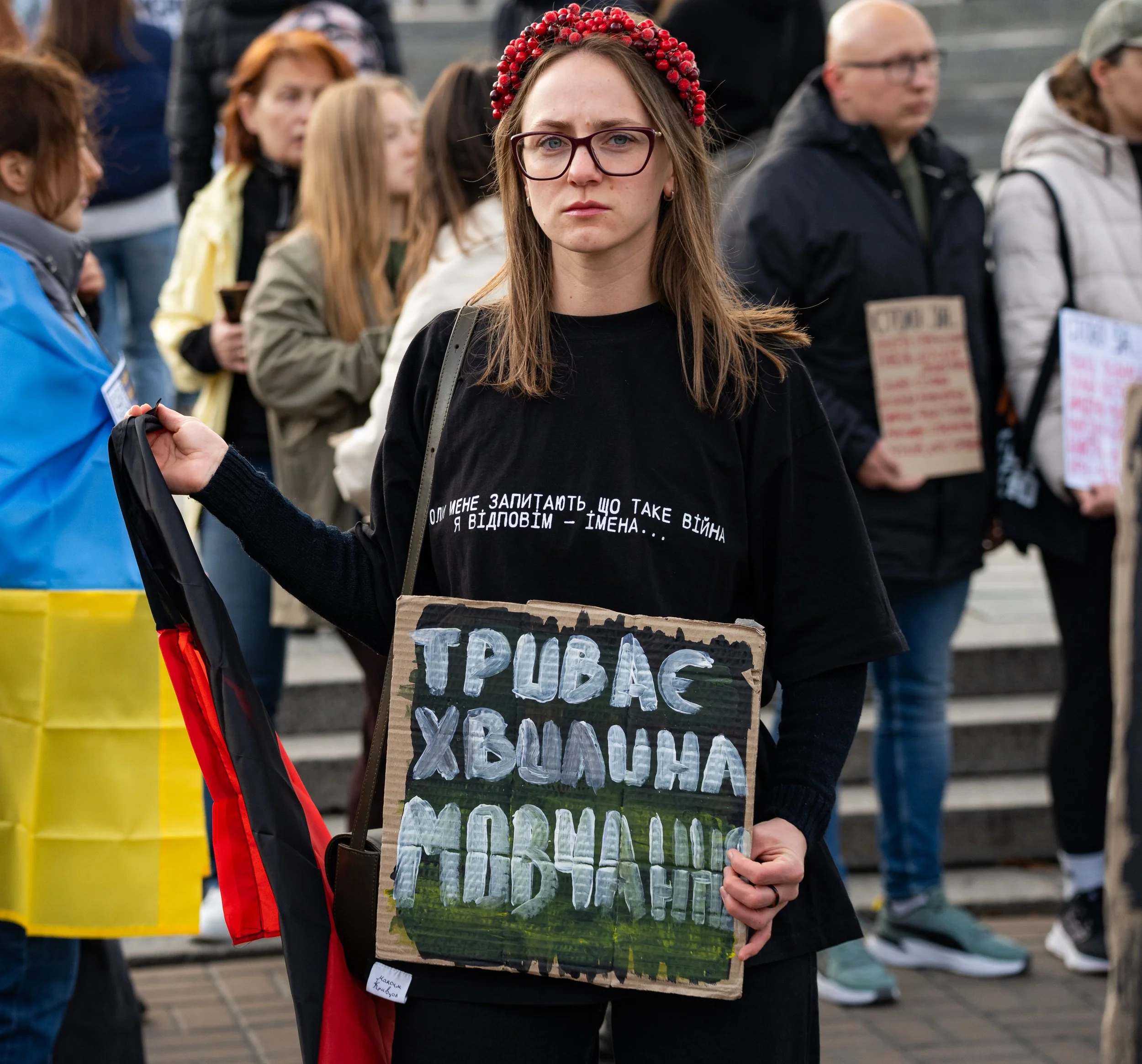 01 October, 2025 - Kyiv, Kyiv Oblast, Ukraine: A demonstrator poses for a photo with her placard calling for respect for a minute’s silence.