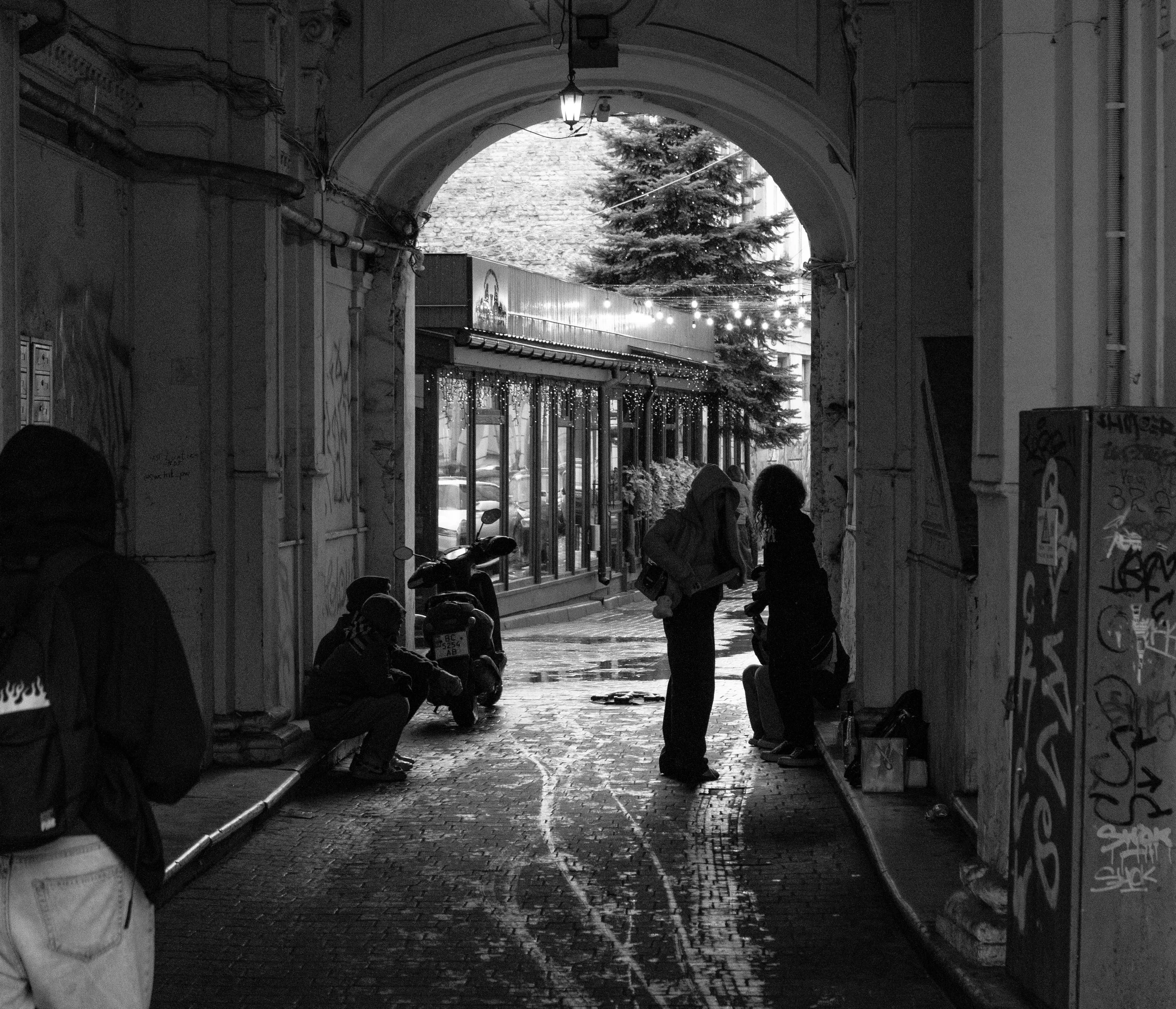 29 September, 2025 - Lviv, Lviv Oblast, Ukraine: Young people hang out in alleyway near a resteraunt. In my time there, Lviv was a very vibrant city full of young faces going about their lives.