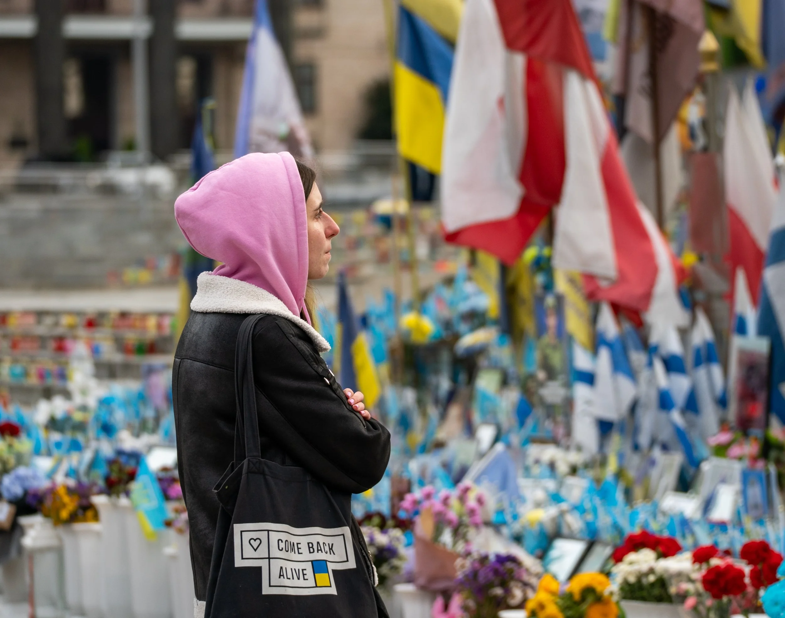 The feeling of Maidan Square is a surreal one. You are immediately greeted by the Independence Monument, a towering statue of a woman holding a guelder-rose branch. It was built in 2001 to commemorate 10 years of Ukraine’s independence from the Soviet Union. As I wait around, I take a moment to walk around the memorial that is on one side of the square. It was an overwhelming feeling, seeing so many faces and so many flags, fighting for a conflict so far from where I have lived my whole life and yet so close to me as a European. Seeing it in person made me wonder only one thing: how have we allowed millions to die for our security and done so little to help? It bothered me immensely.
