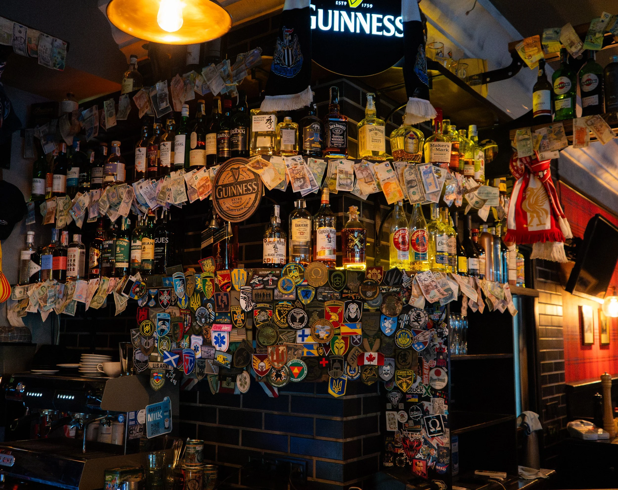 29 September, 2025 - The Winston Churchill Pub, Lviv, Lviv Oblast, Ukraine: The bar is decorated with unit and other morale patches, as well as foreign currency, some with personal messages on them. In the bottom left I noticed an Azov unit patch with a wolfsangel rune, a reminder that even though Putins claims are broad and unfounded, Ukraine has had an identity issue with a select few of its military units for use of Nazi insignia. Many Azov units, though, such as the famous ‘3rd Brigade’, have since rebranded to remove such runes from their logo, but the old design is still occasionally found.