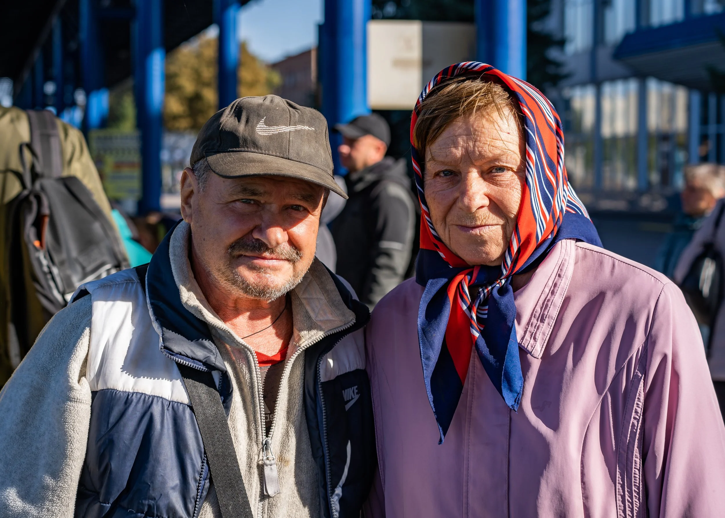 04 October, 2025 - Sumy, Sumy Oblast, Ukraine: Volodomyr and Vira pose for a photo in Sumy train station, before departing to go home to their village.