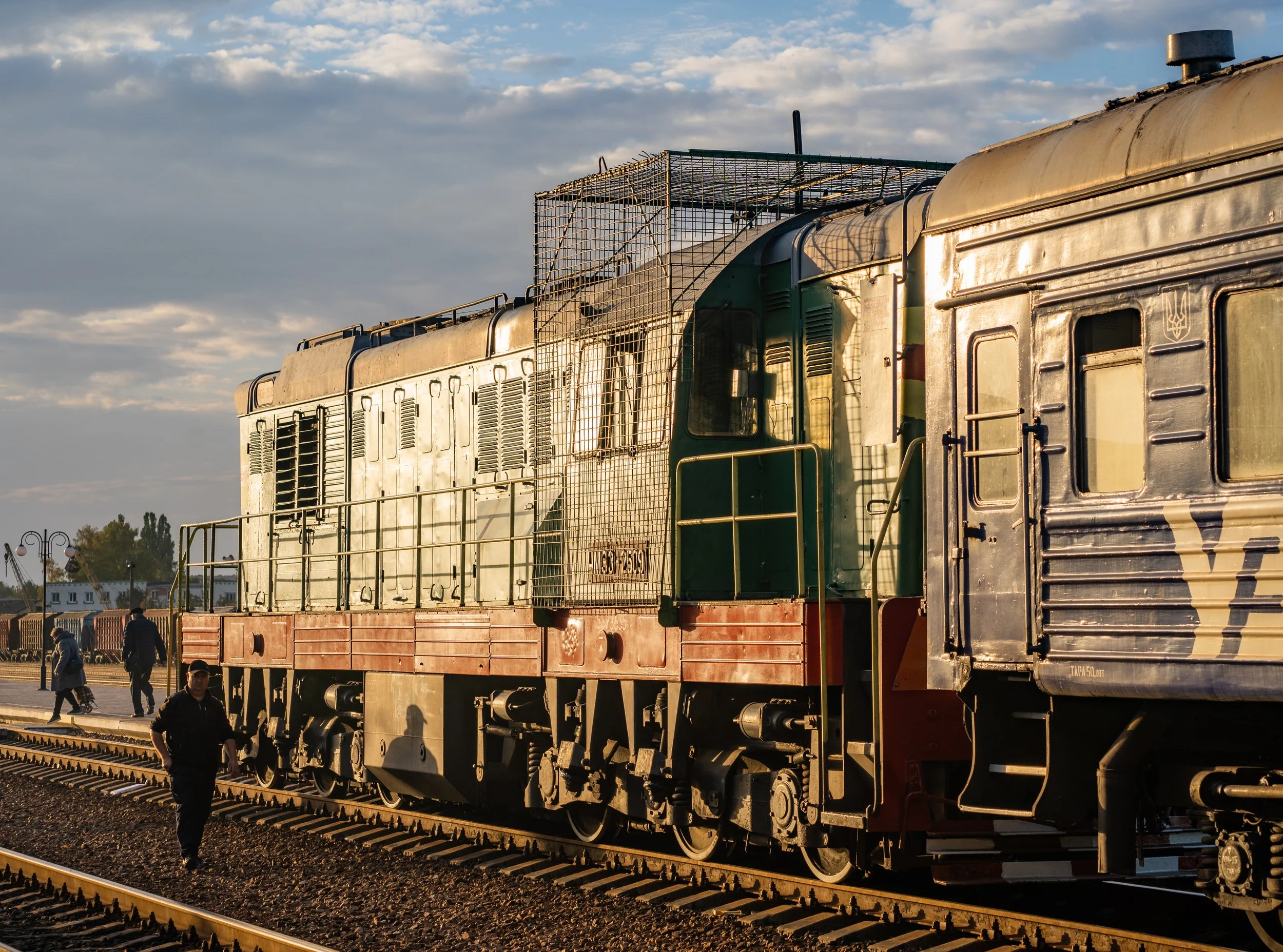 After making it to Lviv train station my hopes of seeing its grand entrance hall were dashed, as it was blocked by security services, with some 50 people waiting to get in. I couldn’t figure out what was going on, so I found a side entrance to the tunnels underneath the station that led to the platforms and patiently waited for my train, which would be delayed by an hour. Lviv station was cold and bleak, the electronic board crackling as it switched between Cyrillic and English. Finding my train was a breeze, but waiting in the cold was not. Big old Soviet-era diesel trains rolled past now and then, shaking the earth as they did. Looking outside the station, I could peek into a cargo area and saw a transport train roll in with what looked like a U.S.-made Navistar MaxxPro MRAP (Mine Resistant Ambush Protected vehicle), a large armoured truck designed to move troops quickly and with decent protection. Turning around, a large sleeper train, also going to Kyiv, had pulled in and was being serviced. An attendant wearing a poncho over his uniform smoked a cigarette next to a hose secured to the train, which was leaking some fluid as he paced up and down. I was praying it wasn’t gasoline.